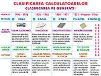Clasificarea pe generații (I-V). Clasidicarea după perfoemanțe: Microcalculatoare, Minicalculatoare, Calculatoare mari (mailframe-uri), Supercalculatoare.